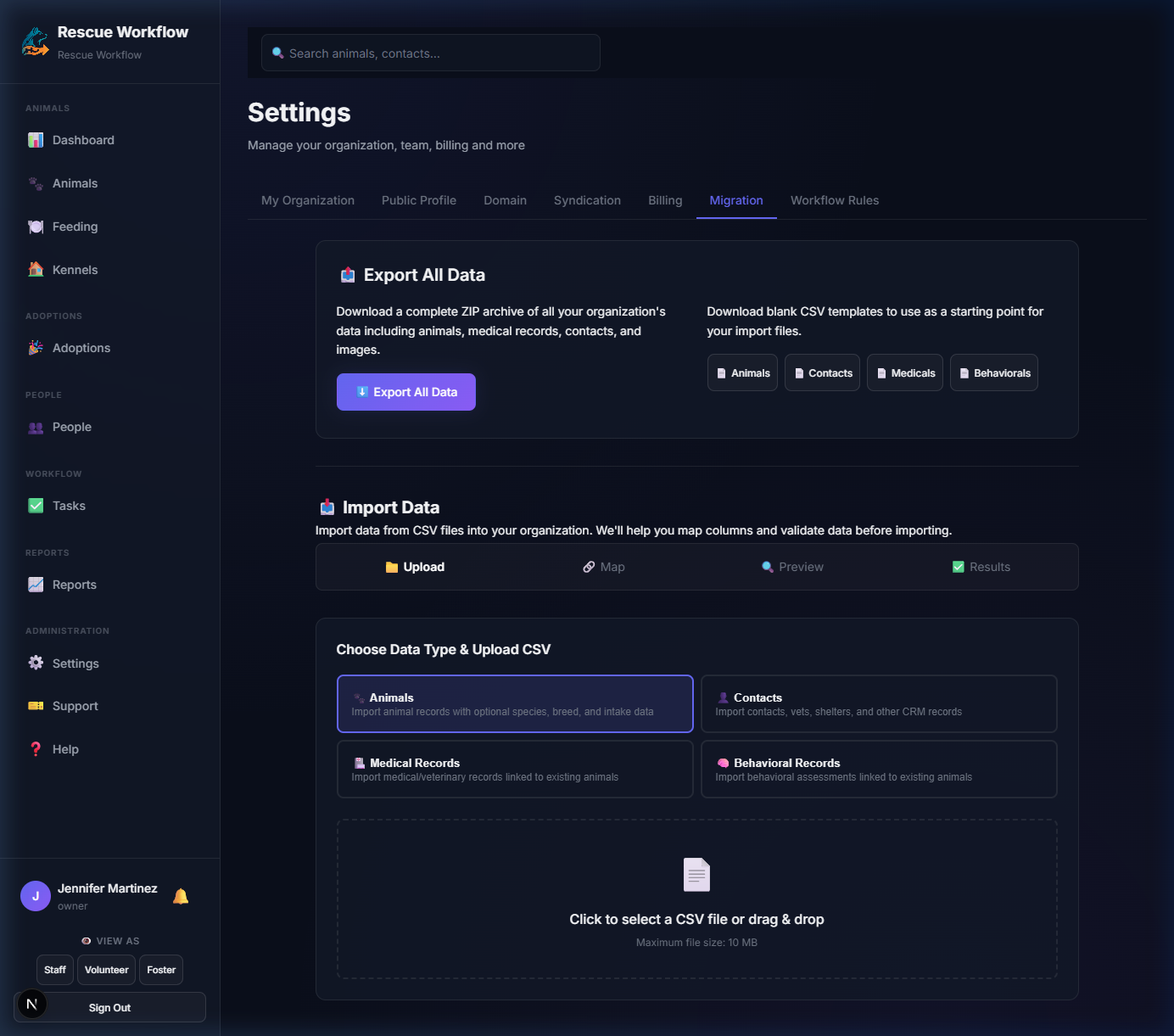 Switching to Rescue Workflow is painless. Import your existing animal records, contacts, medical history, and behavioral records from any CSV file with our guided 4-step wizard that maps your columns, validates your data, and previews results before committing. Export your data at any time — you're never locked in.