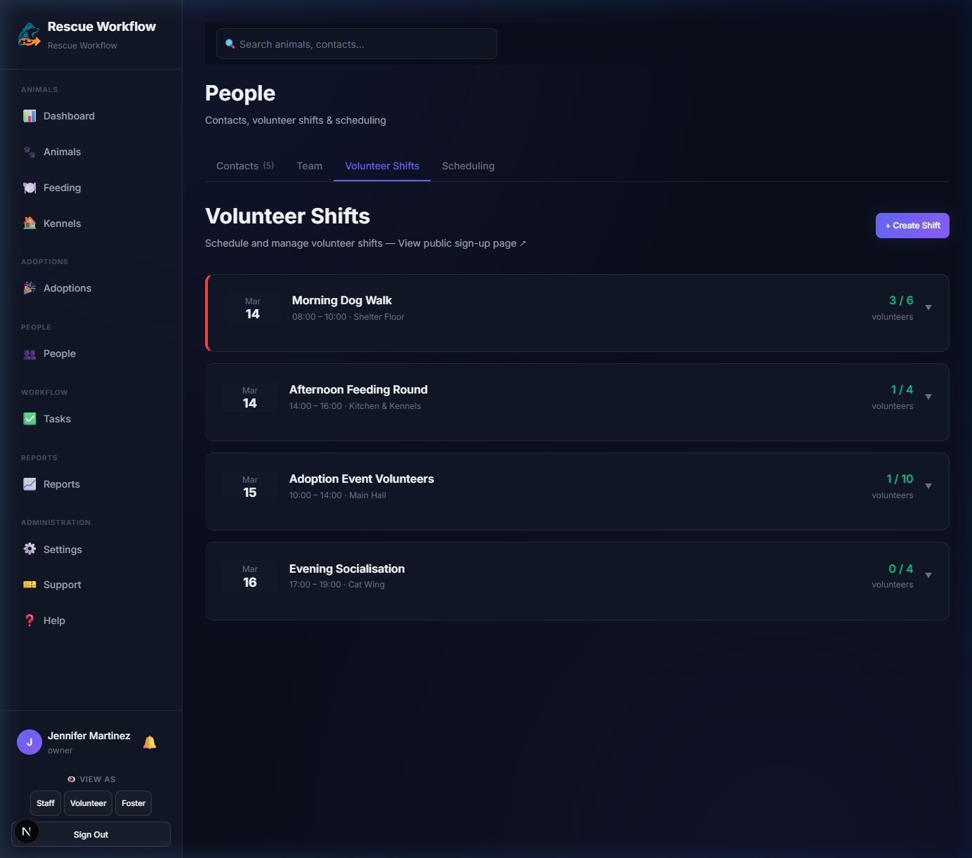 Stop coordinating via group chat. Rescue Workflow's shift scheduler lets staff create shifts, set capacity limits, and post them publicly. Volunteers sign up themselves — no account required.